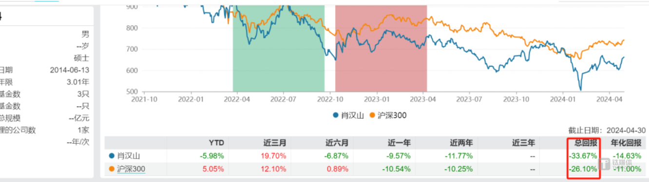 在国投瑞银期间,肖汉山共管理过两款基金产品—国投瑞银创新医疗A和国投瑞银医疗保健行业A,两款产品任职回报分别为-35.88%、-40.29%,用时分别约为3年、2年。根据wind数据,截至4月30日,肖汉山总任职回报为-33.67%,年化约亏损15%,而同期沪深300指数总回报为-26.1%,年化亏损11%。