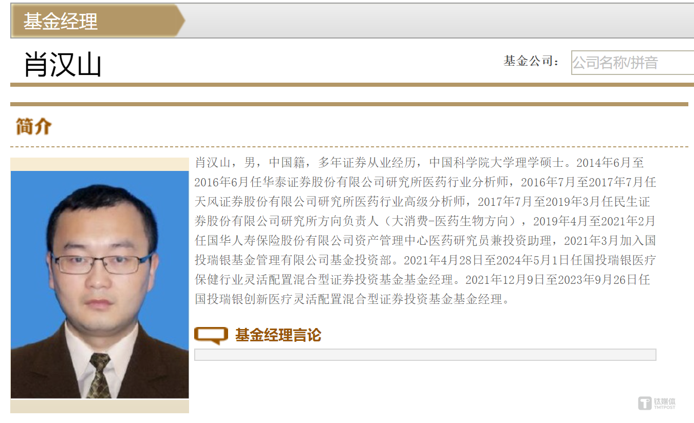 根据基金网信息,肖汉山为中国科学院理学硕士,2014年担任华泰证券医药分析师,由此进入证券行业。2016年7月-2017年7月担任天风证券医药分析师。此后,肖汉山分别在民生证券,国华人寿等机构担任研究员。2021年4月28日-2023年9月26日担任国投瑞银基金经理,关注领域为医药行业。