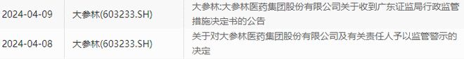 大参林4月9日的公告则显示,因上述同一事由,广东证监局决定对公司、柯云峰、柯国强、梁润世采取监管谈话的行政监管措施,要求上述人员于指定日期携带有效身份证件到广东证监局接受监管谈话。