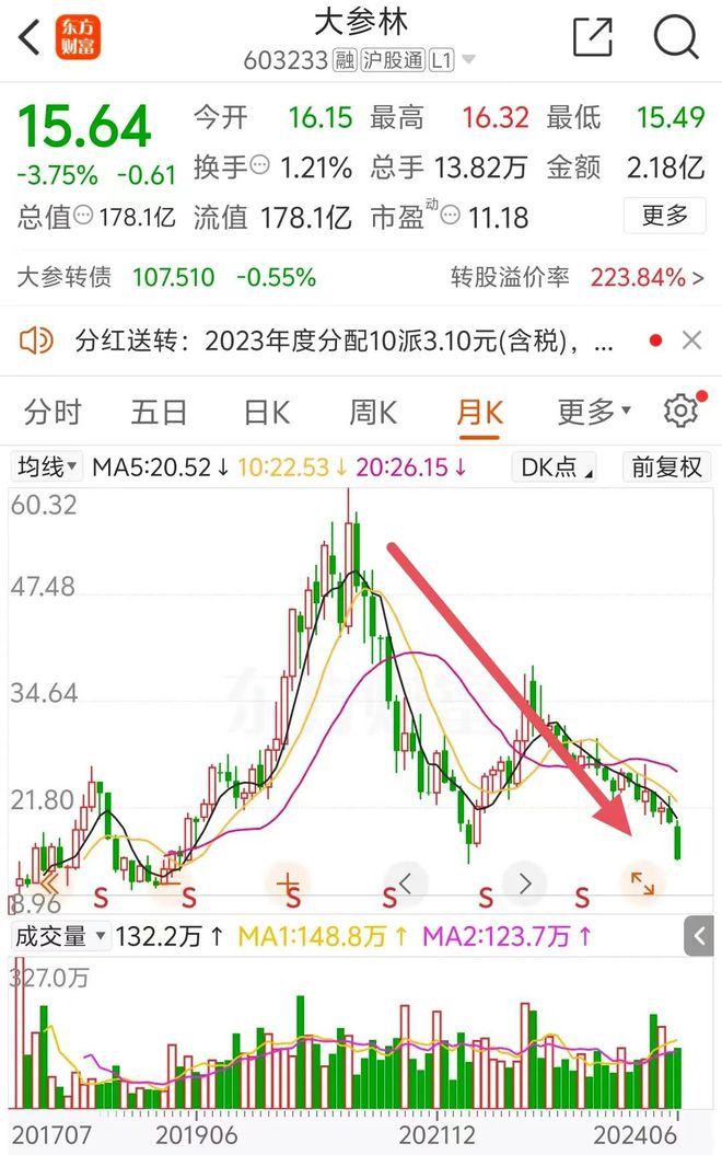 资料显示,大参林成立于1999年,是中国头部药品零售连锁企业,直营业务范围覆盖20个省份(自治区及直辖市),2017年7月大参林在上交所主板上市,成为“连锁药房第一股”。公司股价近年表现较差,自2021年初以来持续处于下降通道,累计跌幅超过70%,最新股价已逼近6年前低位,市值仅剩178亿元。