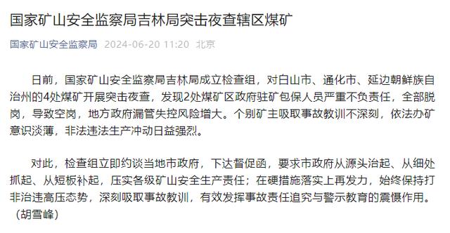 日前,国家矿山安全监察局吉林局成立检查组,对白山市、通化市、延边朝鲜族自治州的4处煤矿开展突击夜查,发现2处煤矿区政府驻矿包保人员严重不负责任,全部脱岗,导致空岗,地方政府漏管失控风险增大。个别矿主吸取事故教训不深刻,依法办矿意识淡薄,非法违法生产冲动日益强烈。