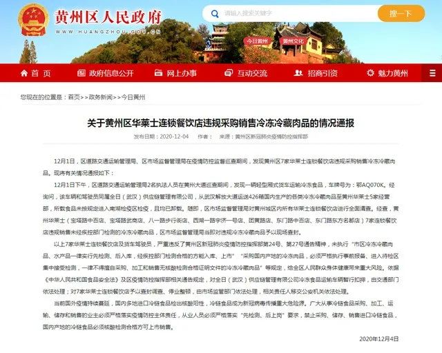 2020年12月,据湖北省黄冈市黄州区人民政府网站通报,该区的7家华莱士因违规采购销售未经疾控部门检测的冷冻冷藏肉品,被当地执法部门查封,相关负责人被拘。为其提供货物的供应商——全日(武汉)供应链管理有限公司受到行政处罚。