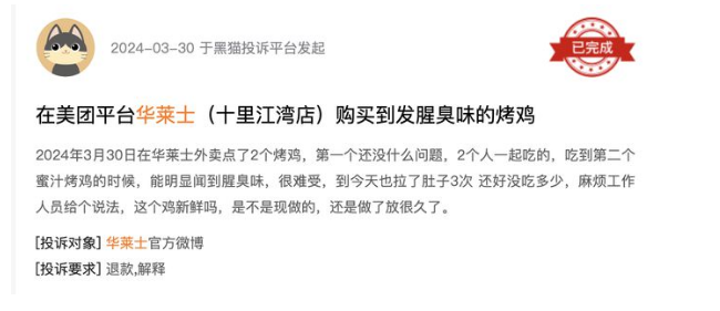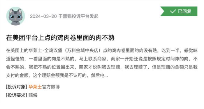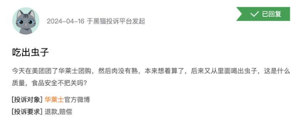 据新浪黑猫投诉平台,以华莱士为关键词在黑猫投诉平台搜索发现,共发现6379条相关投诉,其中不少投诉内容涉及食品安全,比如发现异物、食材不熟、食物发臭/变质等。