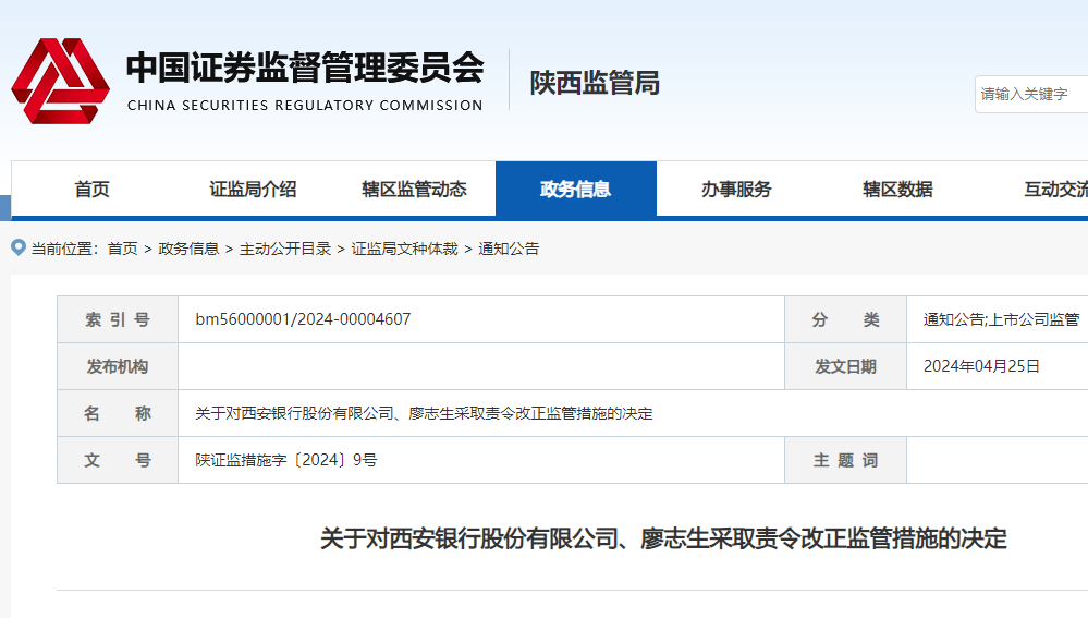 时间回到今年4月25日,陕西证监局网站公布了《关于对西安银行股份有限公司、廖志生采取责令改正监管措施的决定》,指出“廖志生明知连续任职已超6年,仍继续任职并领取津贴,至今未向董事会提交书面辞职报告”。对此,监管部门对西安银行及相关人士采取责令改正的监管措施。