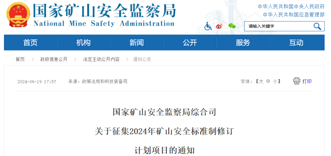 为进一步完善矿山安全生产标准体系,优化标准供给结构,根据《矿山安全标准工作管理办法》等相关规定,国家矿山安全监察局决定组织开展2024年矿山安全标准制修订计划项目征集工作。现将有关事项通知如下: