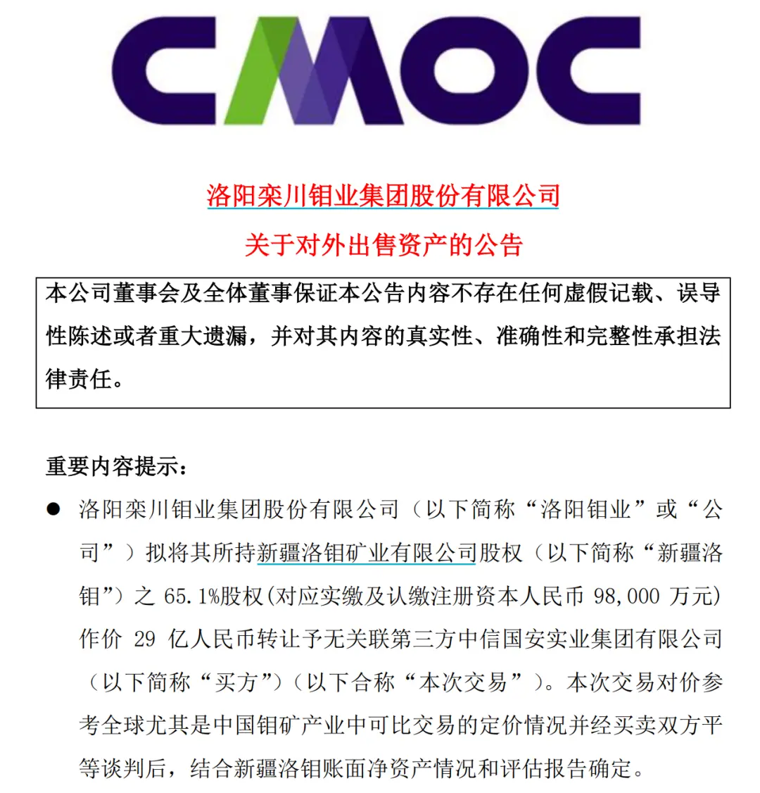 公告显示,洛阳钼业拟将所持有的子公司 新疆洛钼矿业有限公司(以下简称新疆洛钼)股权的65.1%股权(对应实缴及认缴注册资本9.8亿元),作价29亿元转让予无关联第三方中信国安实业。