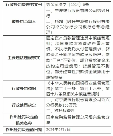 国家金融监督管理总局近日披露的罚单显示,宁波银行绍兴分行因贷款资金被挪用于股权投资等4项违规被罚款165万元。具体违规是:1、固定资产贷款管理违反审慎经营规则;2、项目贷款发放管理严重不审慎,不执行受托支付管理要求,贷款资金长期滞留贷款发放账户;3、贷款“三查”不到位、部分贷款资金未按约定用途使用;4、贷后管理不到位,部分经营性贷款资金被挪用于股权投资。