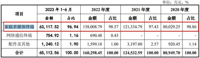 但从 感臻智能的营业收入构成来看,主要来源是“家庭多媒体终端产品”,其实就是电视机顶盒。报告期内(2020年到2022年),公司“家庭多媒体终端”收入占比分别为98.86%、97.43%和98.57%。