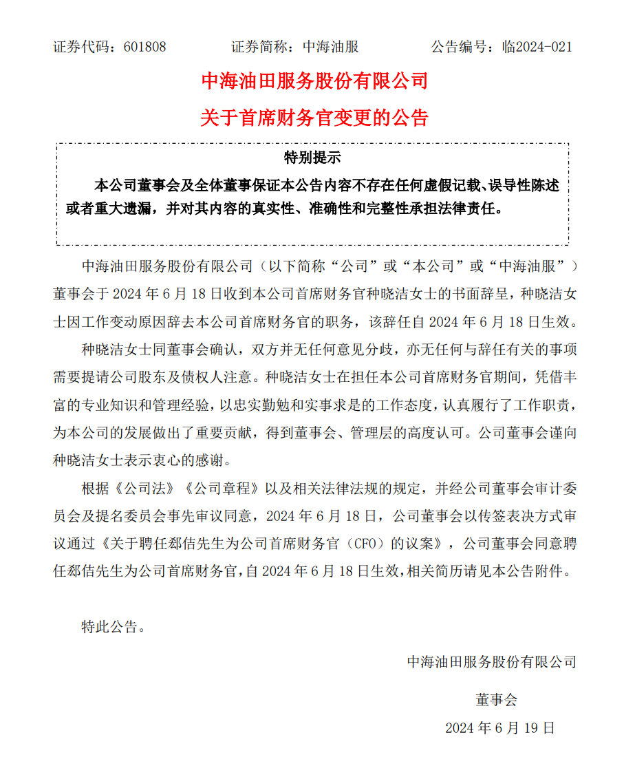 6月19日,中海油服发布公告称,公司董事会于6月18日收到本公司首席财务官种晓洁女士的书面辞呈,种晓洁女士因工作变动原因辞去本公司首席财务官的职务,该辞任自6月18日生效。