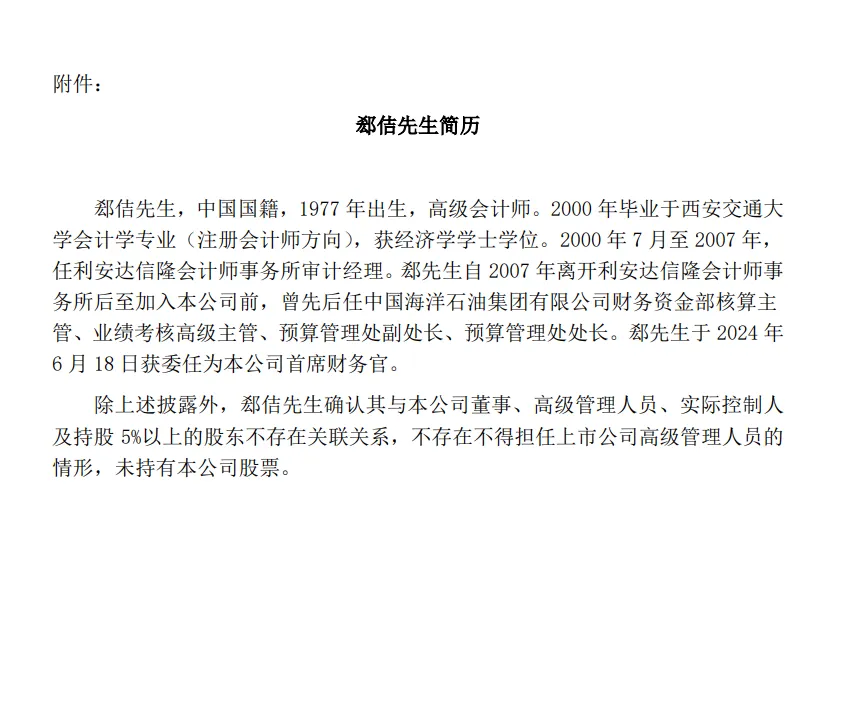 同时,根据《公司法》《公司章程》以及相关法律法规的规定,并经公司董事会审计委员会及提名委员会事先审议同意,6月18日,公司董事会以传签表决方式审议通过《关于聘任郄佶先生为公司首席财务官(CFO)的议案》,公司董事会同意聘任郄佶先生为公司首席财务官,自6月18日生效。