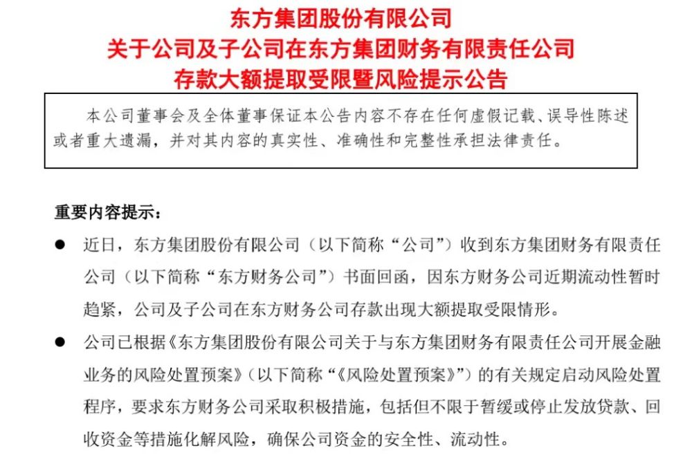 东方集团表示,已启动风险处置程序,要求东方财务公司采取暂缓或停止发放贷款、回收资金等措施化解风险,确保东方集团资金的安全性、流动性。东方集团称,上述情况将增加其短期流动资金周转压力,对其生产经营和偿债能力产生不利影响。