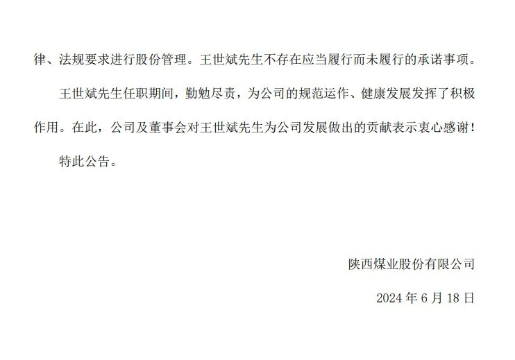 6月18日,陕西煤业发布公告称,公司董事会近日收到董事、总经理王世斌先生递交的书面辞职报告。王世斌先生因年届退休申请辞去公司总经理以及第三届董事会董事、董事会专门委员会相关职务。