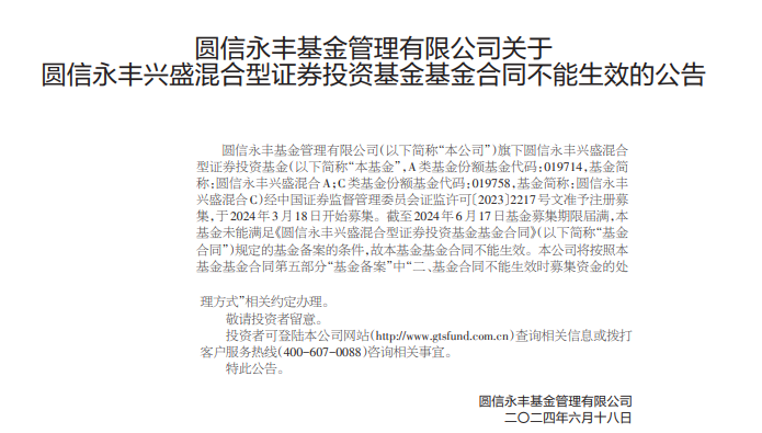 今日,圆信永丰基金公告称,圆信永丰兴盛混合于2024年3月18日开始募集,截至2024年6月17日基金募集期限届满,因未能满足基金合同规定的基金备案条件,故基金合同不能生效。
