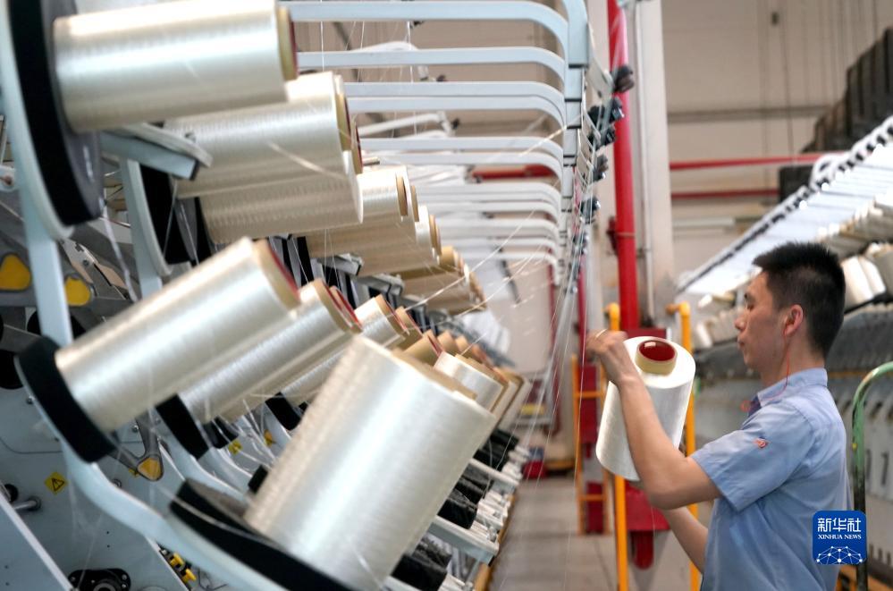 工作人员在中国平煤神马集团帘子布发展公司的捻线车间对上纱架空锭位进行小丝更换(3月28日摄)。新华社记者 李安 摄