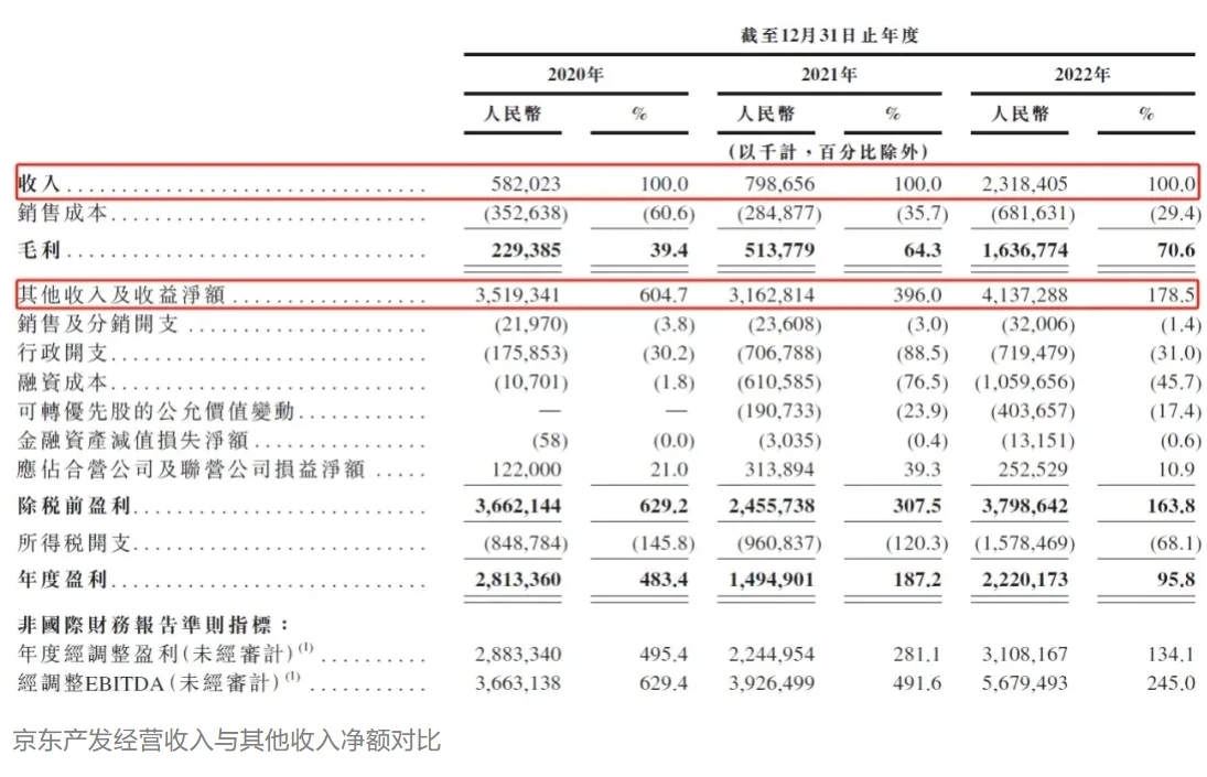 值得注意的是,长期以来,京东产发其他收入及收益净额都明显高于经营收入。2022年,京东产发其他收入及收益为41亿元,是经营收入的近2倍。这其中,在建投资物业的公允价值收益影响最大,2020年~2022年,这一项收入分别为23亿元、24亿元及37亿元。