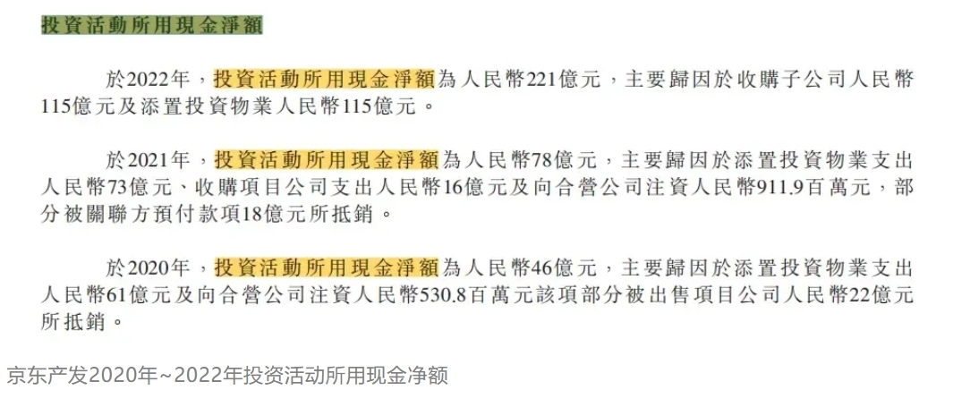 京东产发的发展明显偏向“重资产”,招股书显示2022年京东产发投资活动产生的现金流量净额为净流出221亿元。如此庞大的资金流出,很显然是为了并购项目和买地,而为了满足租户需求,京东产发不得不重资产运作好地段。