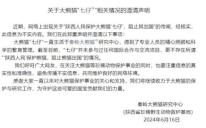 央视网消息:据“秦岭大熊猫研究中心”微信公号发布《关于大熊猫“七仔”相关情况的澄清声明》(下称《声明》),其中表示,近期,网络上出现关于“陕西人民保护大熊猫‘七仔’,阻止其出国”的传闻,经核实,此信息为不实内容。