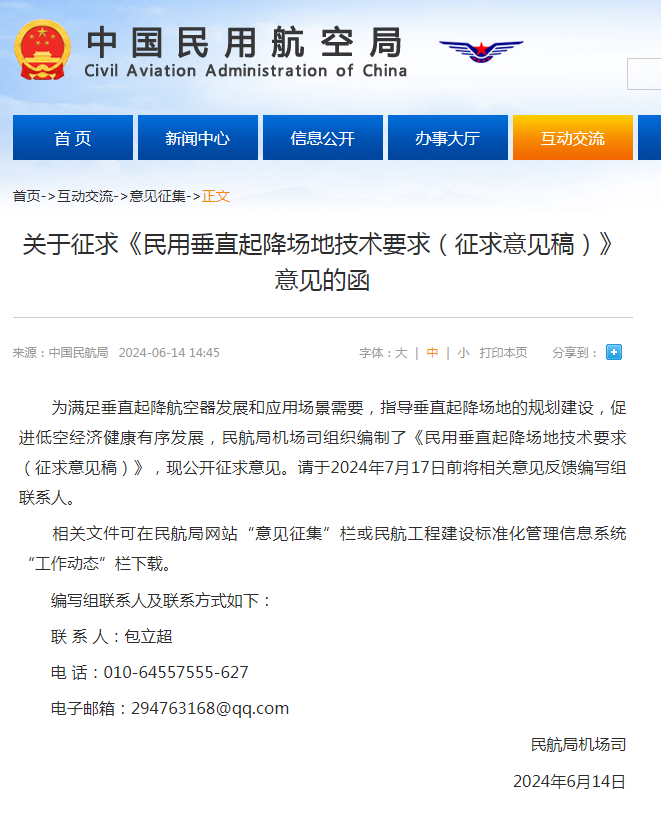 中国民航局就《民用垂直起降场地技术要求(征求意见稿)》公开征求意见。《征求意见稿》提出,垂直起降场地的通信、导航、监视设施配置应满足VCA的指挥控制、导航、通信的要求。