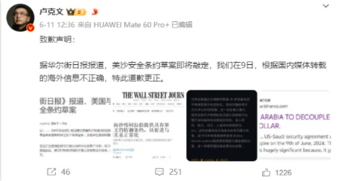 颇有意思的是,就在本月早些时候,某国内财经自媒体大V还曾报道,美沙安全协议将到期(同样是6月9日),沙特王储提前告知美国不再续约,这意味着沙特石油也将不再与美元绑定。但随后美媒却爆料,美国与沙特有望敲定安全条约草案,该大V不得不公开承认自己转载了错误新闻,并将之前的微博删除。
