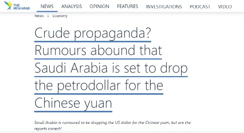 总部位于伦敦的《新阿拉伯人报》(Newarab)指出,有关沙特放弃石油美元的报道不断涌现,但事情可能并不像表面看起来的那样简单,其直接在文章标题里对此打上了“谣言”的标签。该报认为,尽管美国和沙特阿拉伯曾在1974年举行会谈,就结束利雅得主导的对包括华盛顿在内的以色列盟友的石油禁运进行谈判,但没有证据表明存在一项有效期50年的官方协议。