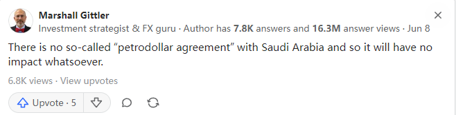 在号称美国“知乎”的quora上,也有不少网友表示由于美国与沙特之间不存在所谓的“石油美元协议”,因此该消息不会产生任何影响。
