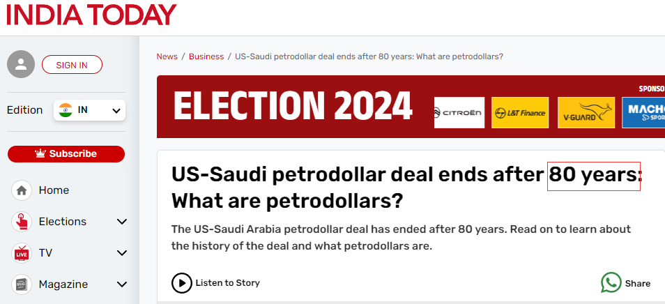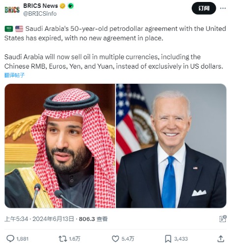 两者看上去似乎确实能对应上。但问题是,至少在正式的官方层面,当时的报道并没有任何协议明确提及石油要用美元结算,更关键的是,也并没有任何证据表明相关协议将在2024年6月9日到期。