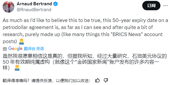英国企业家Arnaud Bertrand在X平台上也表示,“虽然我很愿意相信这是真的,但据我所知,经过大量研究,石油美元协议的50年有效期纯属虚构(就像这个”BRICS News“账户发布的许多内容一样) ”。
