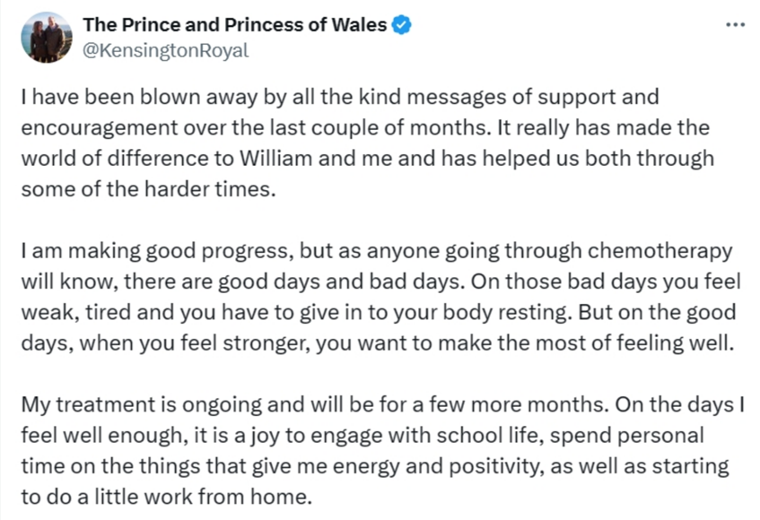今年3月份,凯特官宣自己罹患癌症,她的医疗团队建议她接受一个预防性化疗过程,她说期待自己的身体早日康复。
