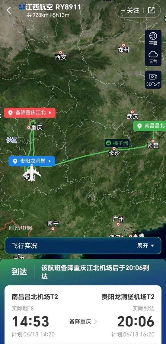 随后,大皖新闻记者从贵阳龙洞堡机场了解到,6月13日,江西航空RY8911航班确有备降重庆,当天差不多时段,也有其他航班到重庆备降的情况。