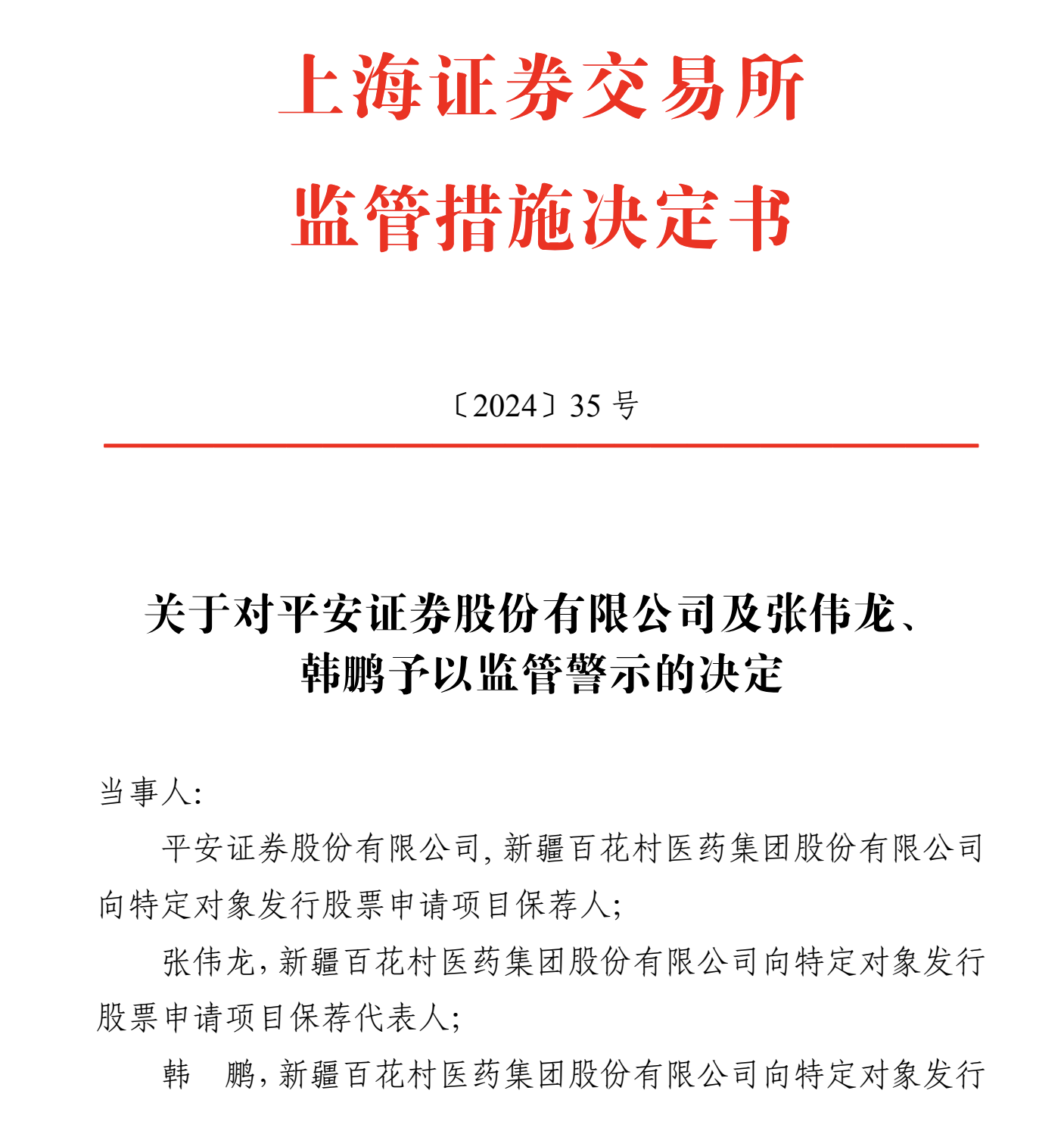 6月12日,上海证券交易所(简称“上交所”)更新两份监管措施决定书。因保荐职责履行不到位,在百花医药非公开发行股票发行上市过程中,存在实控人变更未及时报告及披露等违规情形,平安证券及保荐代表人张伟龙、韩鹏,百花医药被采取监管警示措施。