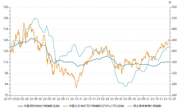 对于业绩大幅下滑,公司做出的解释是:2023年是钢铁行业极具挑战的一年。钢铁行业运行呈现“需求减弱、价格下降、成本高企、利润下滑”的态势,提质增效难度加大。企业效益同比下降,行业盈利水平持续低位。下图为2022-2023年炼焦煤、铁矿石、钢材综合价格指数。