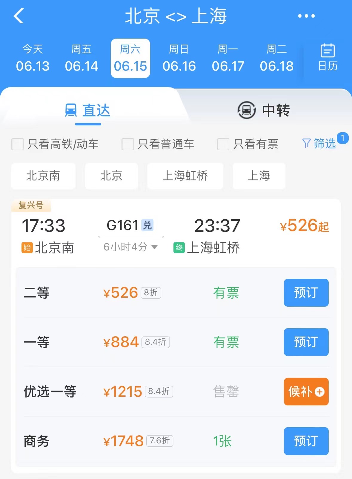 6月13日,澎湃新闻查询铁路12306APP发现,6月14日及15日,部分上海虹桥站往返北京南站的车次上新了“优选一等座”选项,但部分车次已售罄。