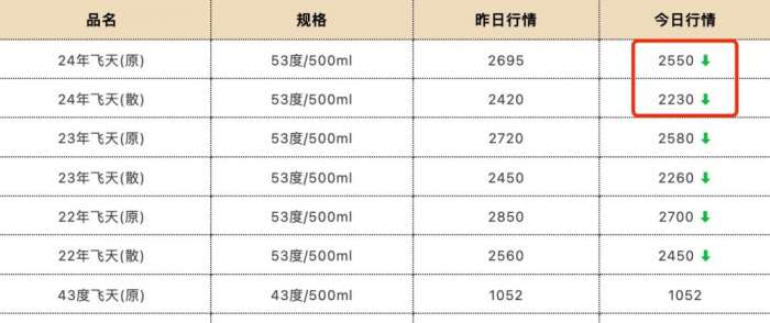 今日酒价14日早间披露的最新参考价显示:飞天茅台散瓶批发参考价从前一日的2420元下跌至2230元,单日跌近两百元。原箱的飞天茅台的批发参考价也从前一日2695元/瓶跌至2550元/瓶,单日跌超百元,下跌速度较前几日加快。