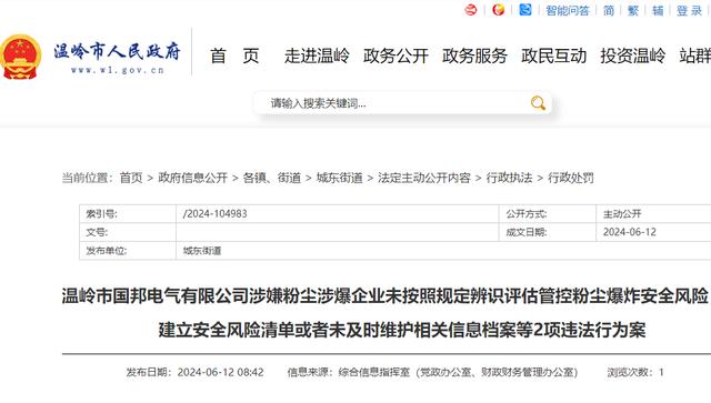 浙江温岭市政府网12日发布行政处罚信息,内容显示,温岭市国邦电气有限公司违反安全生产法相关规定被罚款2万元。处罚信息如下: