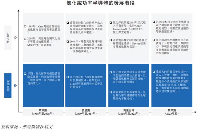 据了解,氮化镓是一种具有高频率和低导通电阻的宽带隙半导体材料,已成为功率半导体行业持续变革的核心。氮化镓功率半导体经历了萌芽期、发展期、商业化期和从2023年开始的繁荣期等多个发展阶段。