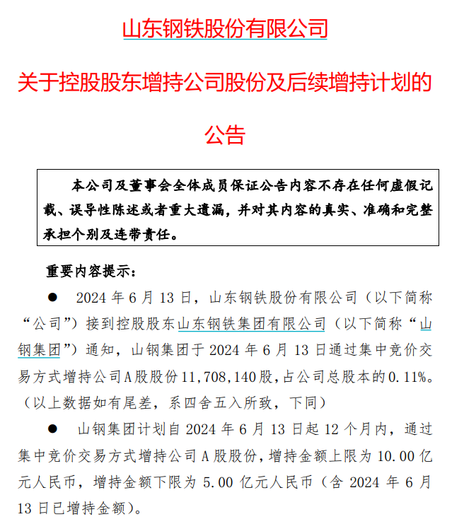 6月13日晚间,山东钢铁公告,接到控股股东山钢集团通知,山钢集团于6月13日通过集中竞价交易方式增持公司A股股份1170.81万股,占公司总股本的0.11%。