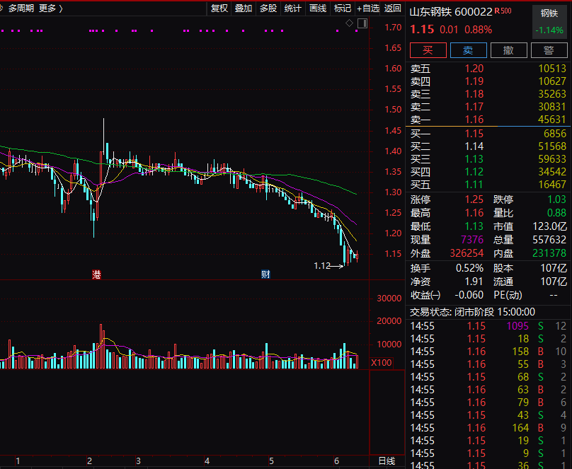 山东钢铁是一家重要的钢铁公司。6月13日收盘,公司股价1.15元,总市值123亿元。