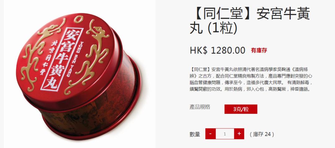 近日,北京同仁堂国药有限公司官网显示,港版安宫牛黄丸价格出现大幅上涨,一粒装价格1280港元。