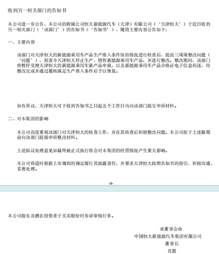 同时,另一相关部门告知书显示,拟责令天津恒大停止生产、销售新能源乘用车产品,并进行整改。具体来看,整改期间,相关部门将暂停受理天津恒大的新能源乘用车新产品申报,以及新能源乘用车产品合格证电子信息传送,待整改完成并通过复核满足生产准入条件后予以恢复。如有异议,天津恒大可于收到告知书之日起五个工作日内向该部门提交申诉材料。