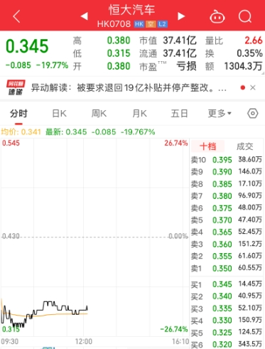 中新网6月12日电(中新财经记者 葛成)12日,恒大汽车低开11.63%,盘中一度跌超20%。