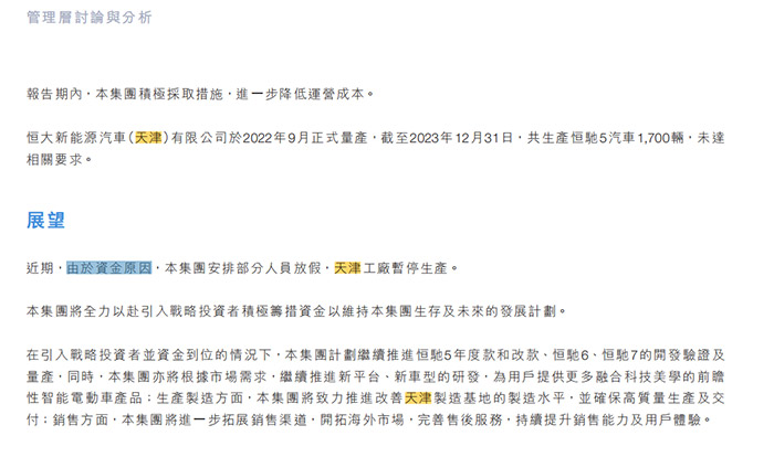 中新财经注意到,此前恒大汽车公布的2023年报曾披露,近期由于资金原因,集团安排部分人员放假,天津工厂暂停生产。
