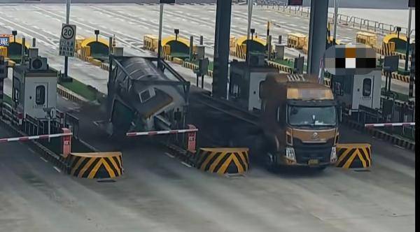 近日,一辆集装箱卡车在经过宁波穿山港区疏港高速一处收费站的ETC通道时,车上25吨重的液体罐体翻落,压扁收费岗亭,所幸亭内无人,未造成人员伤亡。