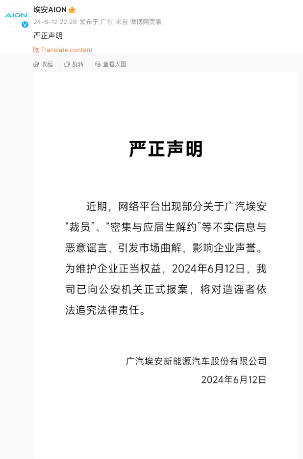 6月12日晚,广汽埃安发布声明:近期,网络平台出现部分关于广汽埃安“裁员”、“密集与应届生解约”等不实信息与恶意谣言,引发市场曲解,影响企业声誉为维护企业正当权益,2024年6月12日,我司已向公安机关正式报案,将对造谣者依法追究法律责任。