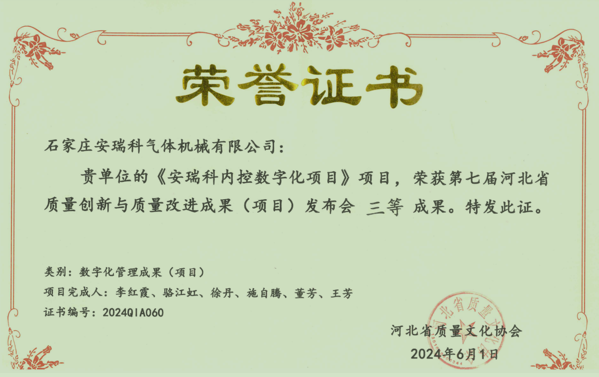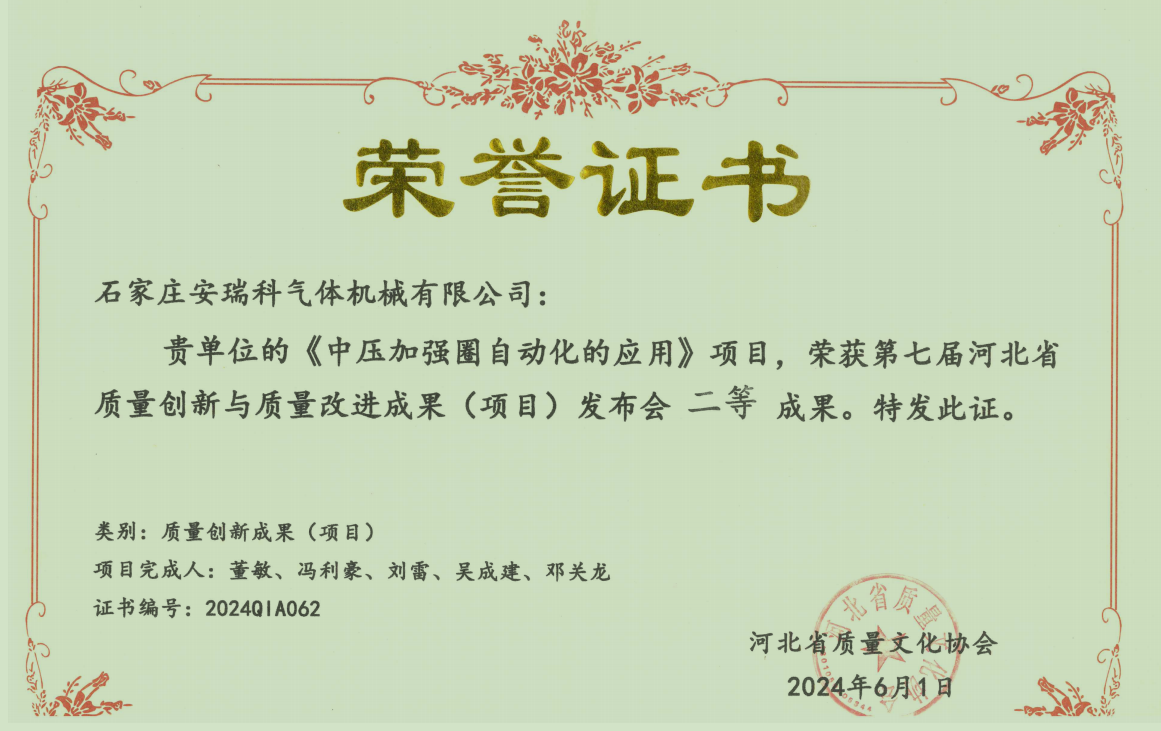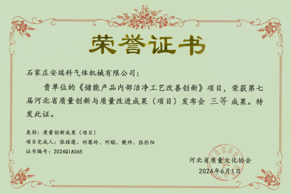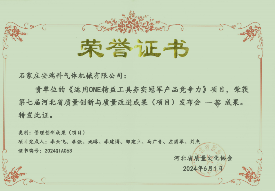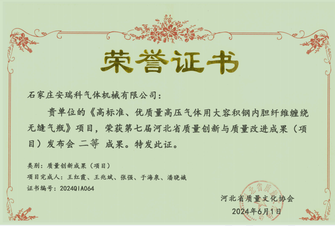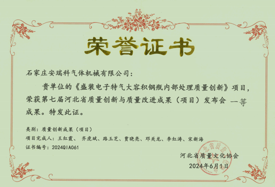 河北省质量文化协会推荐第七届河北省质量创新与质量改进发表优秀成果参加中国质量杂志社举办的2024年度“中国质量创新与质量改进成果发表交流活动”,让参赛者同台交流,进一步提升质量创新能量。石家庄安瑞科气体机械有限公司的《盛装电子特气大容积钢瓶内部处理质量创新》、《运用ONE精益工具夯实冠军产品竞争力》在推荐函中。