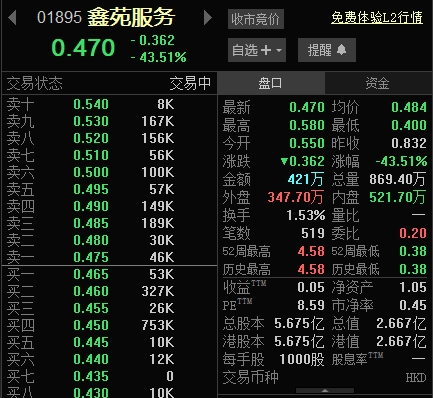 6月12日,停牌一年半的港股鑫苑服务恢复交易,股价大幅低开,跌超40%。