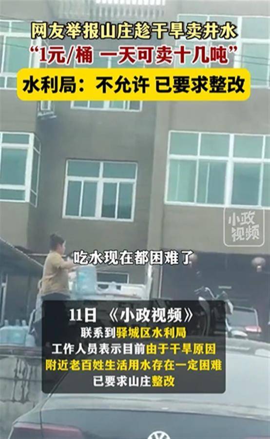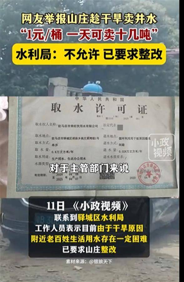6月11日,有网友举报河南驻马店市胡庙乡三架山水库某山庄,趁干旱卖井水。驿城区水利局工作人员表示,不允许这样做,已要求山庄整改。(据6月11日南昌广播电视台小政视频号报道)