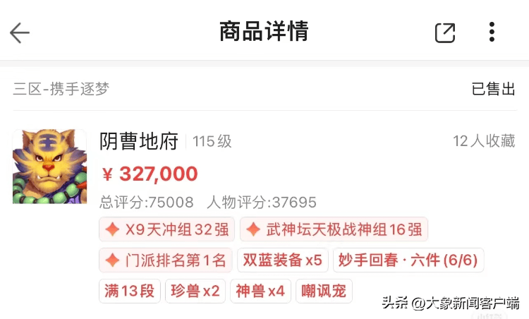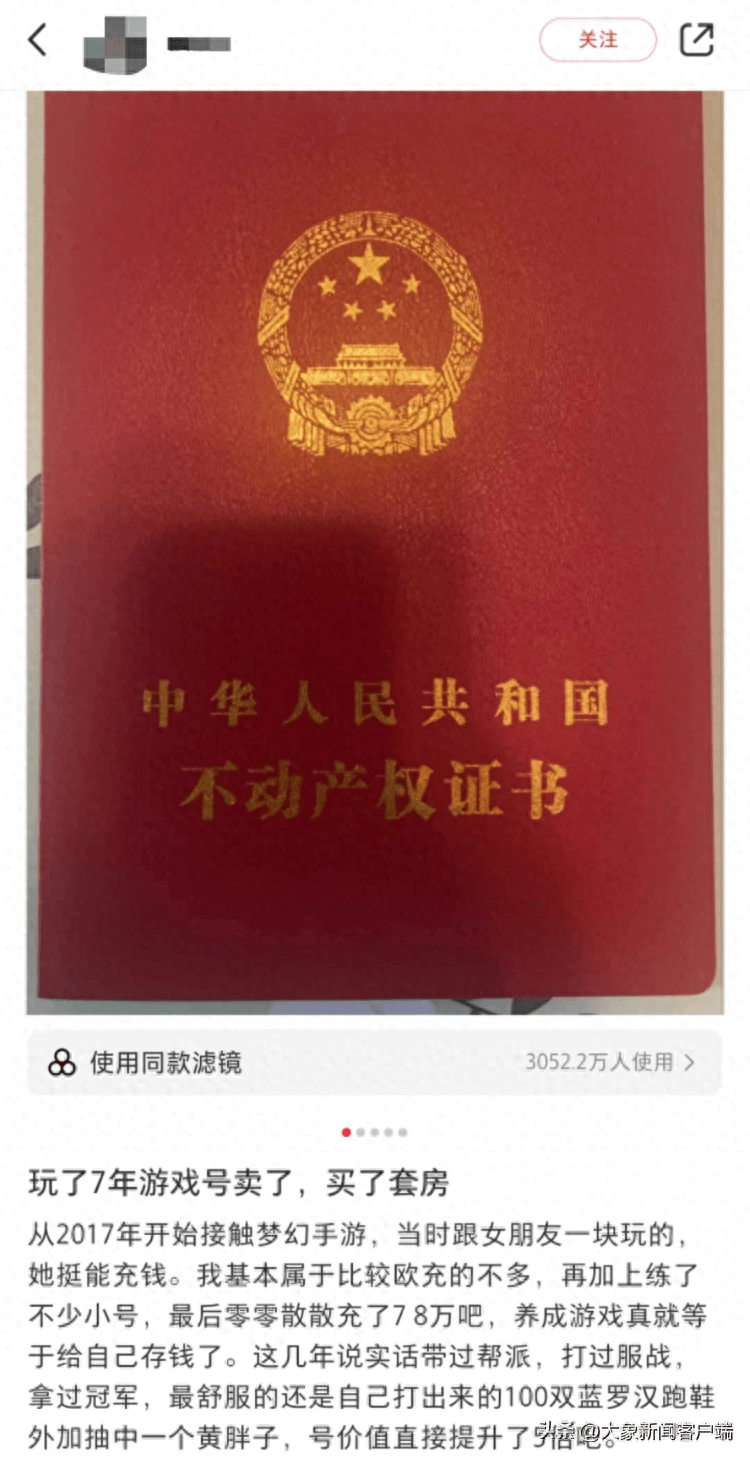 近日,一位《梦幻西游》手游玩家发帖称以32万元售出自己玩了7年的账号并买了房,引来众多网友关注。6月11日,上游新闻记者联系上了这位玩家,他表示自己有本职工作,主要在下班后玩,7年时间“氪金”(游戏内消费)8万元,最近因为喜欢上滑雪才决定暂时离开游戏。这位玩家和业内人士表示,并不建议想通过游戏“搬砖”挣钱的新手玩家进入。