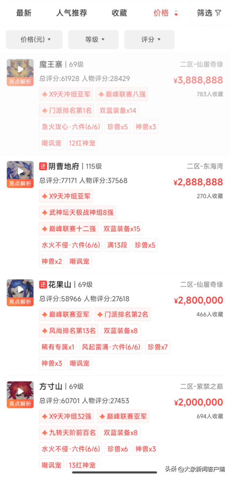 目前“藏宝阁”售价较高的《梦幻西游》手游账号。网络图