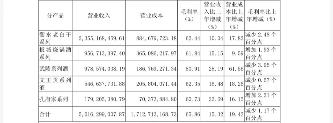 分产品看,老白干酒旗下品牌衡水老白干、武陵系列酒、文王贡系列的毛利率分别为62.44%、80.91%、62.35%,同比减少2.48个百分点、3.95个百分点、0.57个百分点。
