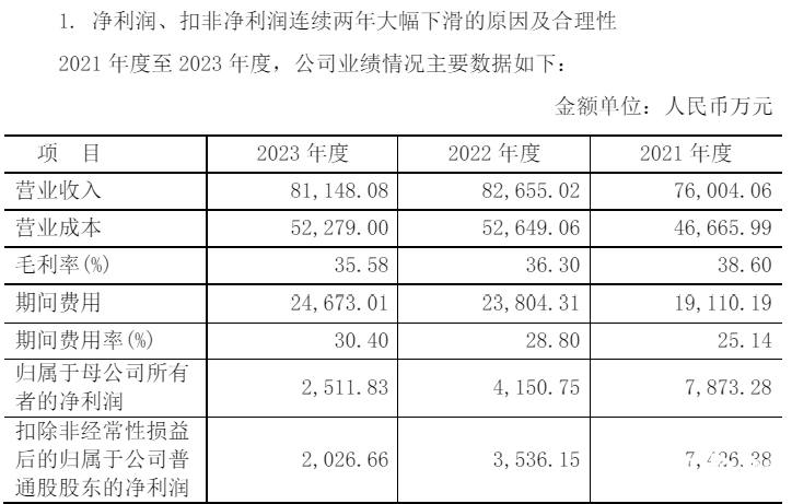 净利润连续两年大幅下滑主要系品牌舆情影响
